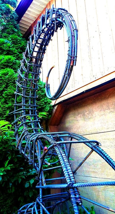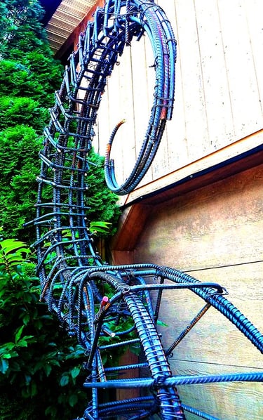 Steel reinforced concrete, the sculpture's core material, is more often associated with the construction of bridges and skyscrapers. This solid base represents a foundation of acquired knowledge and skills, laying the groundwork for perceiving connections that lead to new ideas, inventions and novel ways of looking at and solving problems.